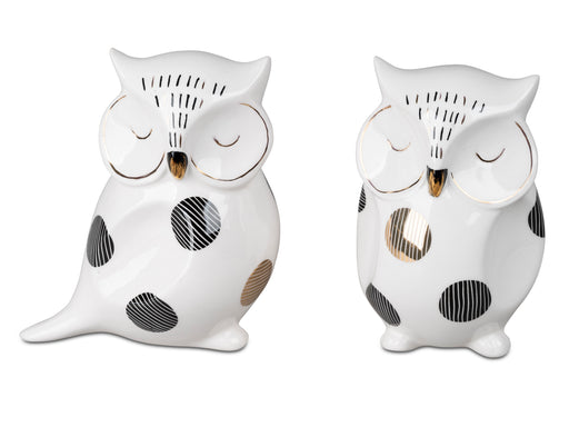 Deko-Eulen 2er Set aus weiss glasiertem Steingut mit schwarz-goldenem Dekor verziert H: 15cm