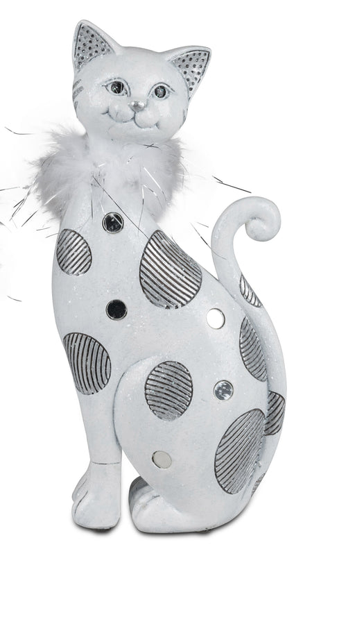 Katze weiss-silber + Federn  aus Kunststein und mit Spiegel-Elementen und Relief verziert Größe: 12 x H:27cm