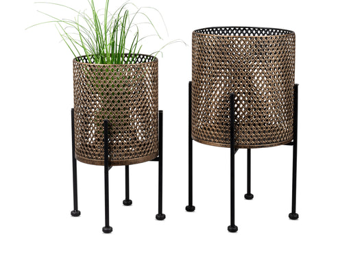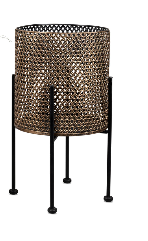 Pflanztopf aus Fuß aus dem Hause Formano aus mattem Metall mit Durchbruch schwatz-gold Ø 20cm, H:40cm