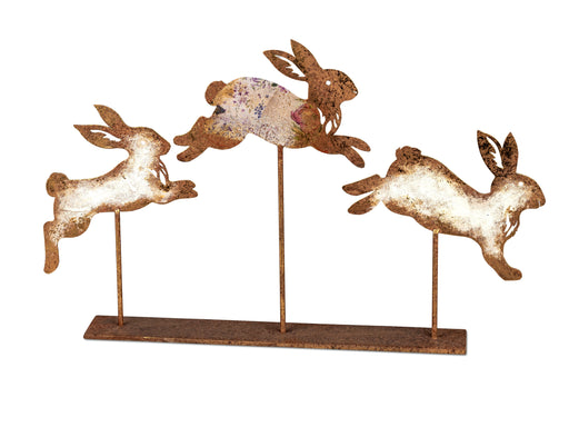 Hasengruppe auf Sockel 50 x 30 x 9cm aus rostigem Metall mit Lithografie-Dekor und goldenem Elementen verziert