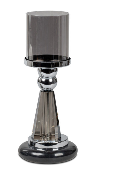 Windlicht auf Marmorfußaus glänzendem,silbernem Aluminiummit grau-getöntenGlas-Elementenkombiniert Größe: Ø 11cm x 28cm